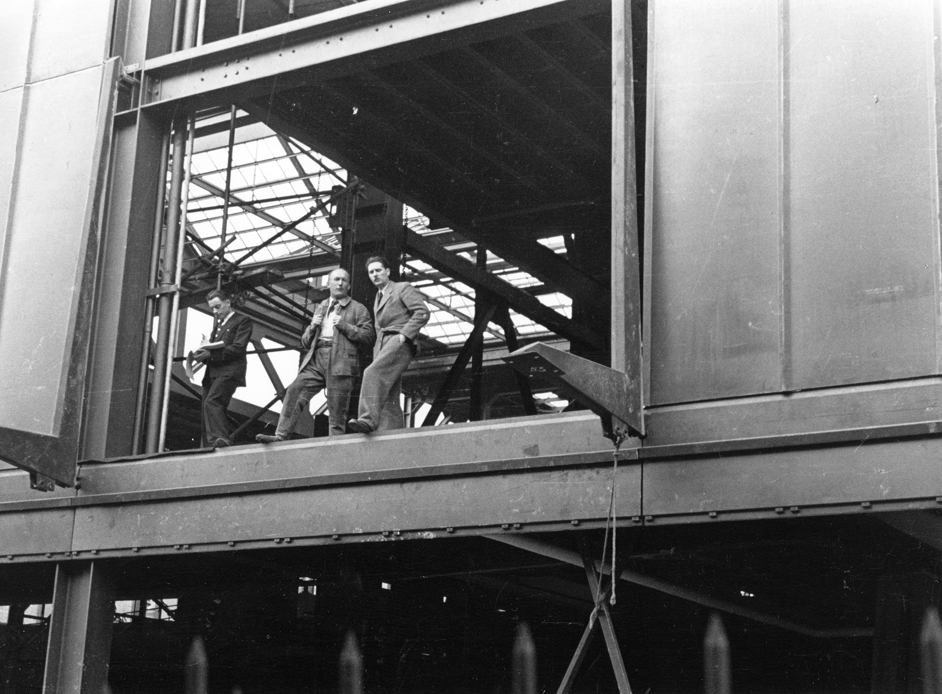 Maison du Peuple, community center (Jean Prouvé, with architects E. Beaudouin and M. Lods, engineer V. Bodiansky). Clichy, 1935–1939. View of the building site with Jean Prouvé. © Fonds Jean Prouvé. Centre Pompidou – MNAM/CCI-Bibliothèque Kandinsky-Dist. RMN-Grand Palais.