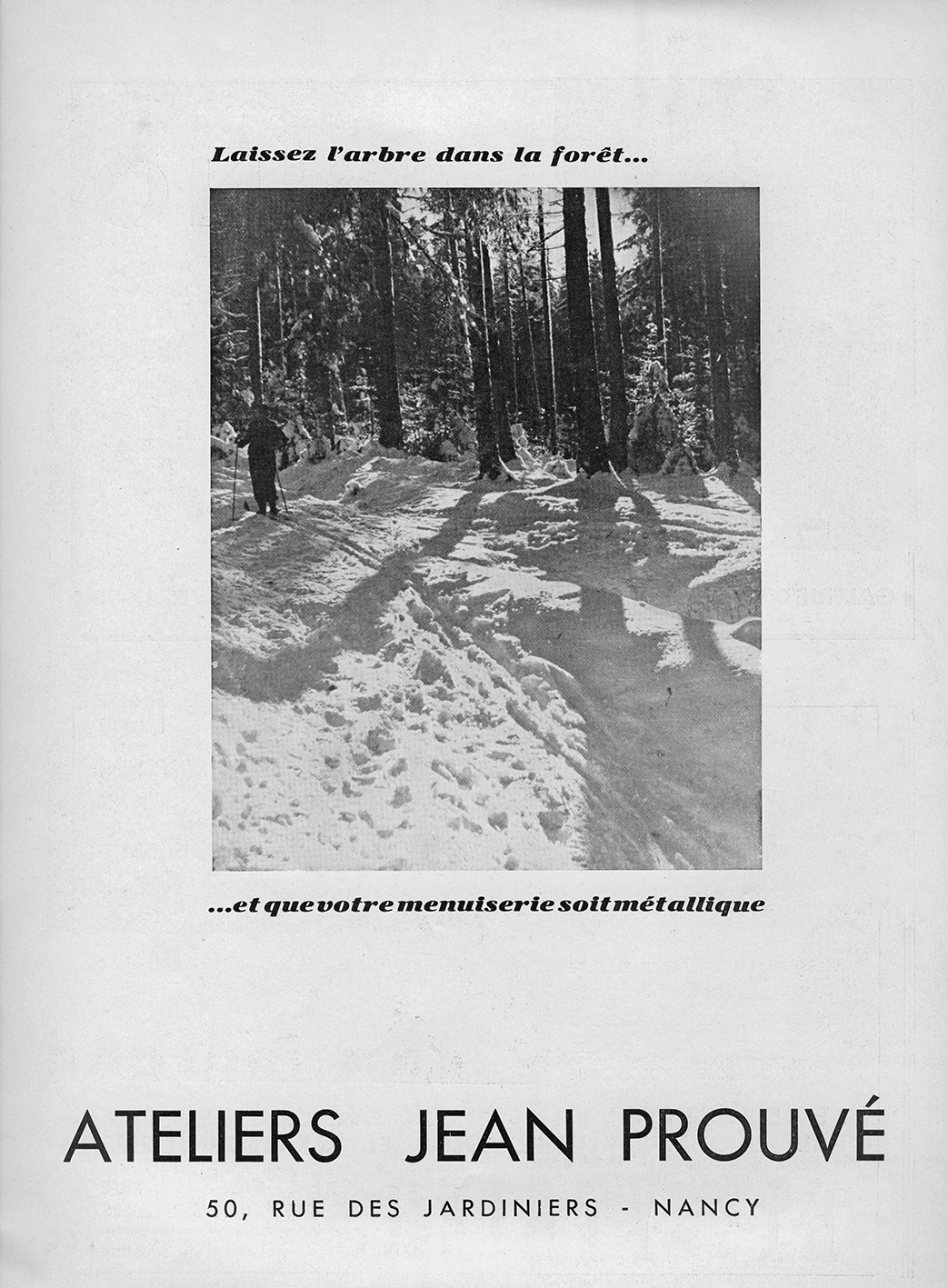 “Leave the tree in the forest… and use metal for your carpentry”. Ateliers Jean Prouvé advertisement in L’ Architecture d’aujourd’hui, no. 2, February 1936. © Collection privée.