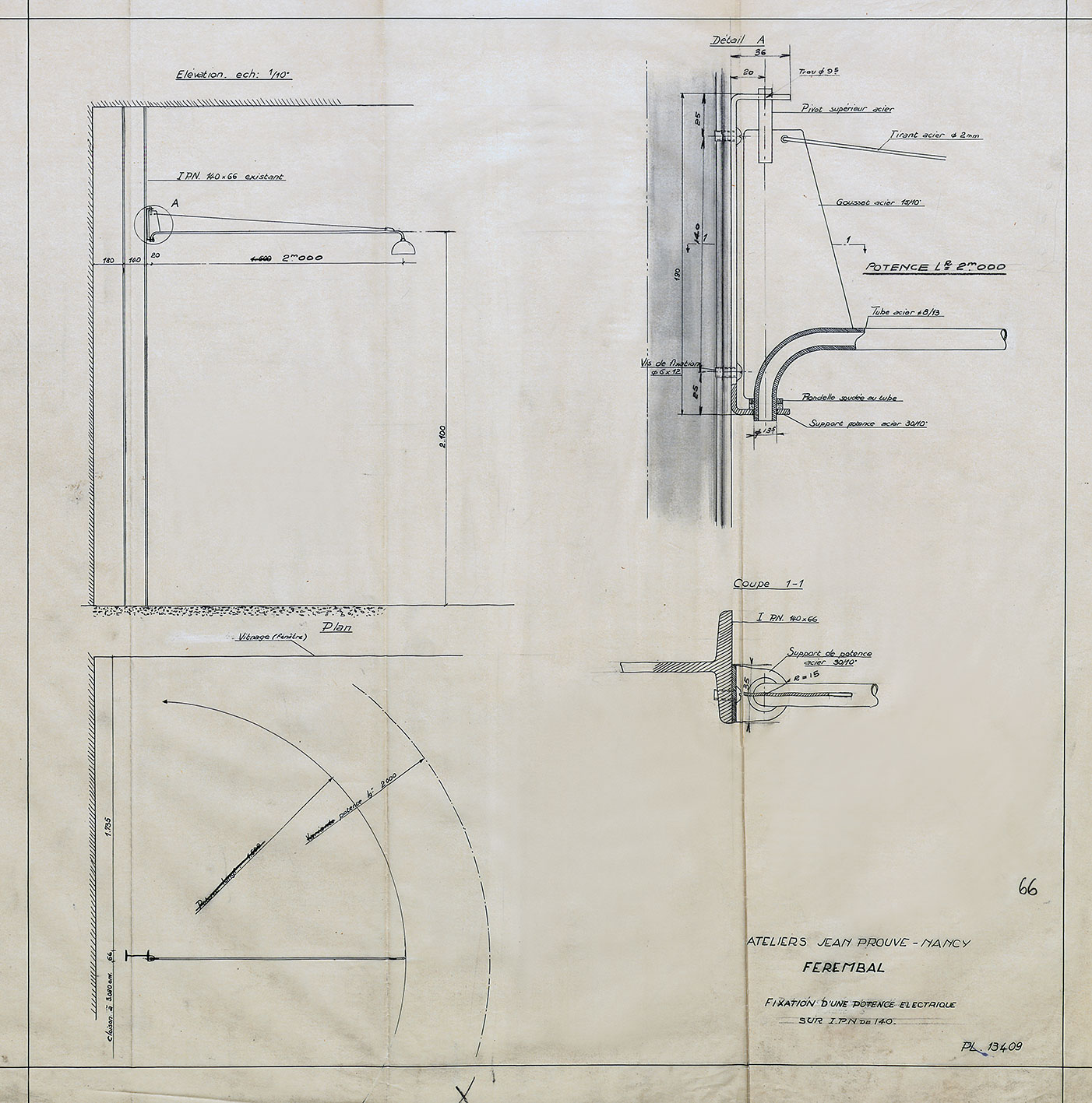 Initially made by Jean Prouvé for his personal use, the tubing “lamp arm” held in place by a steel wire, attached to the wall, and pivoting on its axis was an improvement on the principle developed with Pierre Jeanneret and Charlotte Perriand for the equipping of the temporary SCAL pavilions at Issoire.1 Several successive versions appeared, but all reflected the concern with providing a mass-produced model suited to rooms of different sizes. The swing-jib lamps could also be adapted to existing buildings as a way of simplifying installation and concealing electrical wiring by using the racks of hanging furniture or the cover strips on paneling. The variations bore on the length of the arm (1–2 meters, and even 2.5 meters), its shape (straight, curving, or articulated at the end), the type of mounting, the type of fitting (with or without a switch), and the inclusion of accessories (deflector, directional handle). Included in the catalog since 1947, the Ateliers Jean Prouvé swing-jib lamp, fitted with a conical or cylindrical shade, appears in three sizes in the 1950 catalog, and 150 units were produced in the following year. Adaptable to all uses, this swing-jib lamp no. 602 was as equally well suited to the household, office, and school and university markets.2