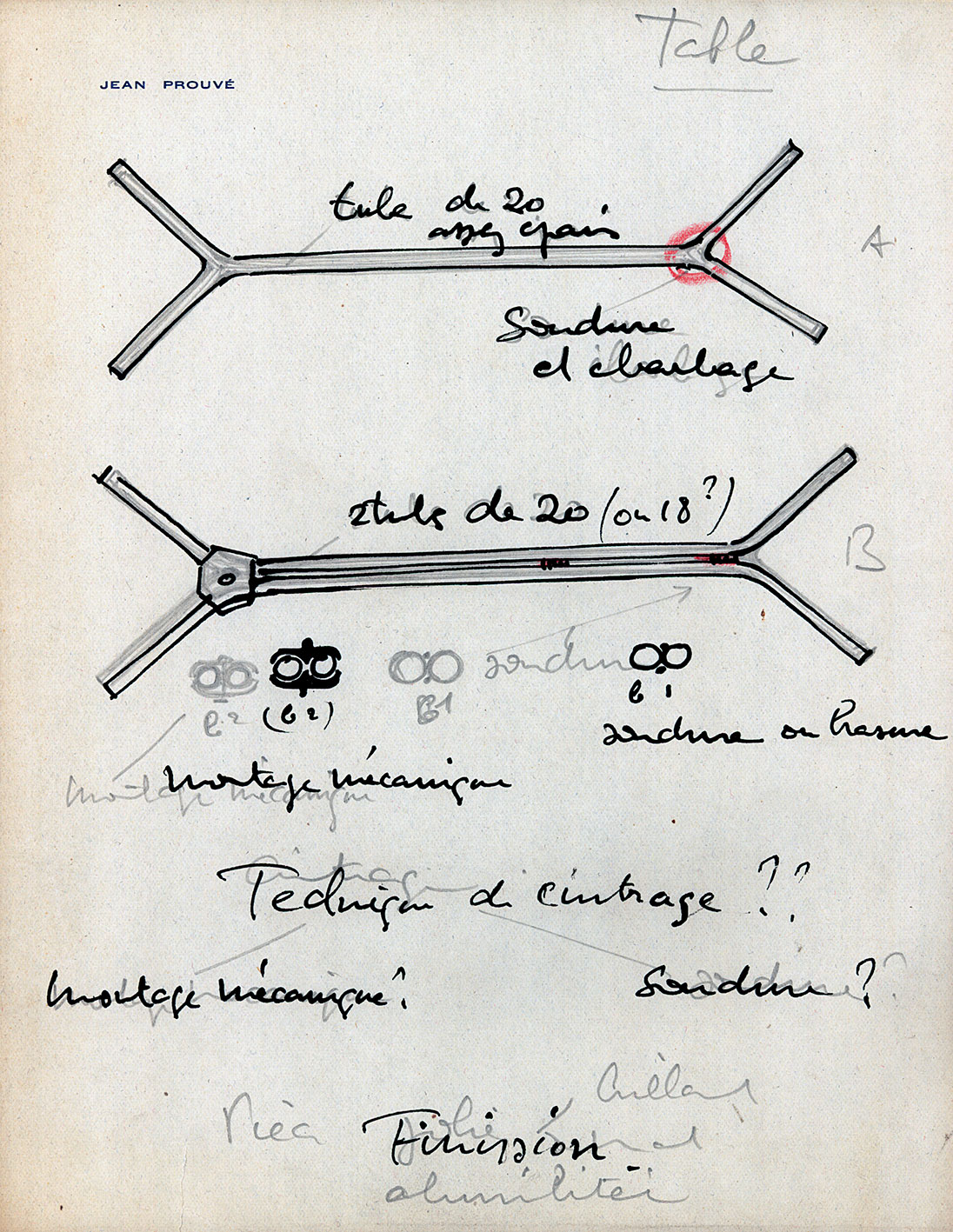 Derived from the prewar prototype, the metal version of the dining table base was finalized in 1951. This was a demountable model, as evidenced by the protrusion of the cap-ends where the crossmember frame meets the brace connecting the bent steel legs. This base was attached to the crosspieces of the upper frame with brackets and screws. Except for the rounded outer edge of the legs, the profiles and proportions are similar to those of the S.A.M. no. 502 wooden table. Of the options for the top, the most frequent was plain or imitation-granite bent sheet aluminum, set on a steel support structure comprising four U-traverses. The metal parts of this model—S.A.M. Tropique no. 503—were often lacquered with contrasting colors. 90 examples were made in 1951. On the version S.A.M. no. 506, the steel frame supported a solid or laminated wood top with or without metal traverses. In the latter case—a small batch made for Air France Congo, in Brazzaville, early in 1952—the legs were screwed directly onto the underside of the laminated top or set into the tops made of solid wood. An all-aluminum variant was designed in 1954 for which a prototype was made. Jean Prouvé also produced drafts of several cast-aluminum bases, to which he returned in 1980 as part of a planned series