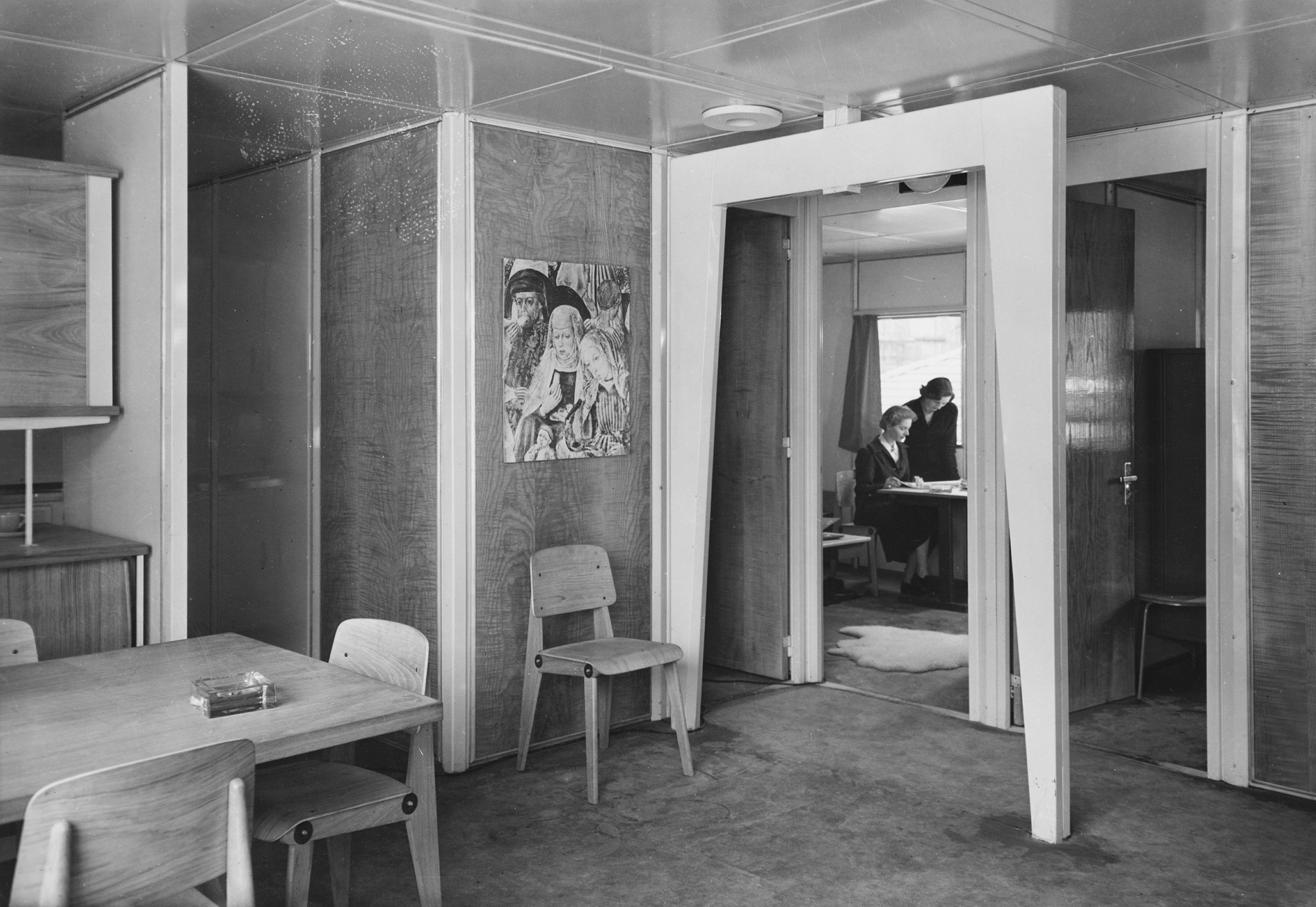 Métropole demountable house Interior views, with Ateliers Jean Prouvé furnishings, of the 8x8 prototype at the Housing Exhibition, Salon des Arts Ménagers, Grand Palais, Paris, February 1950. © Fonds Jean Prouvé. Centre Pompidou – MNAM/CCI-Bibliothèque Kandinsky-Dist. RMN-Grand Palais.
