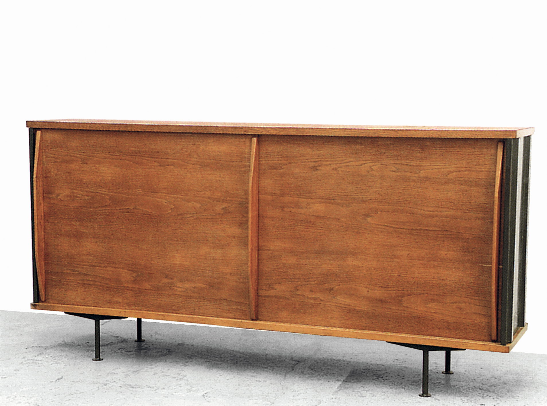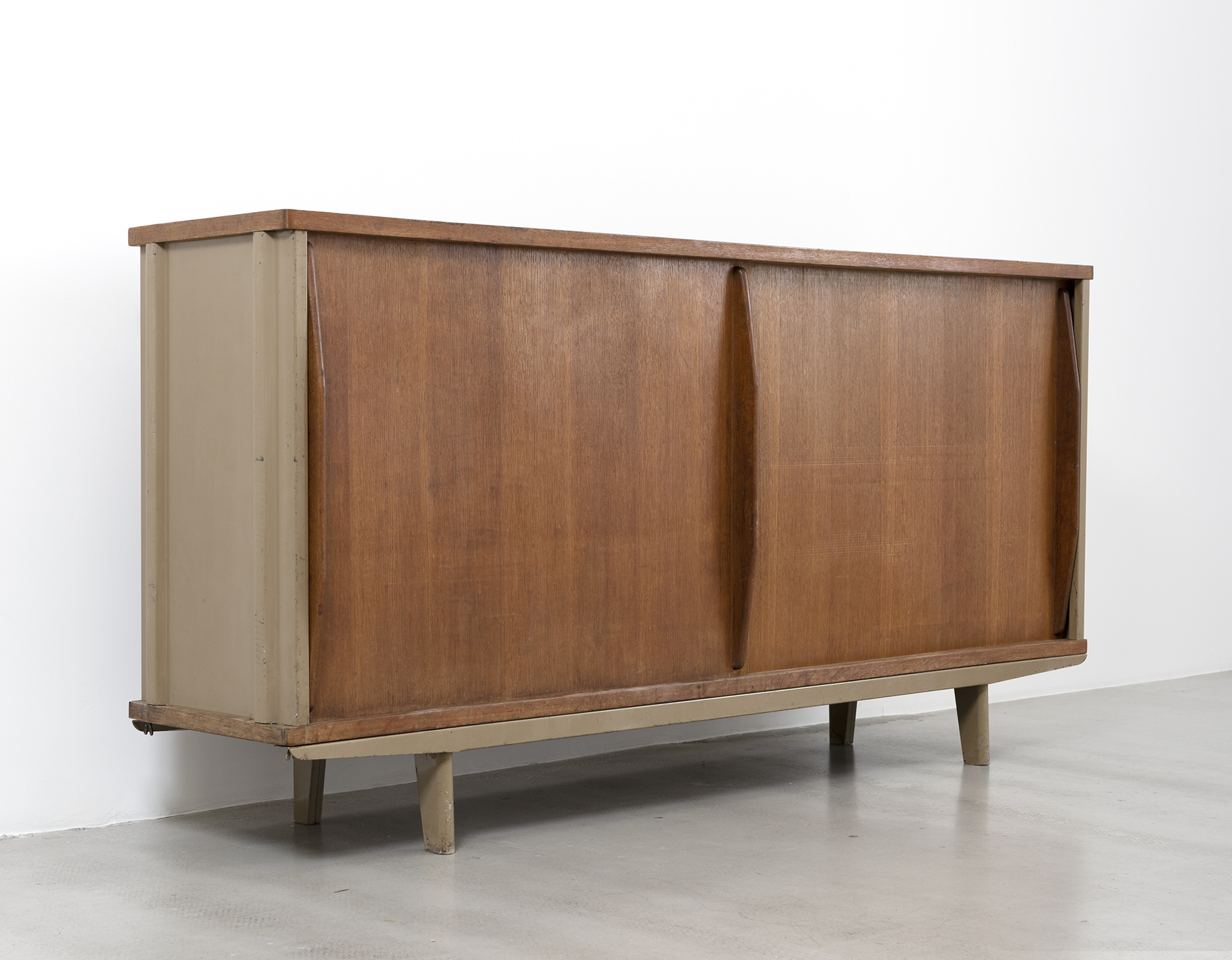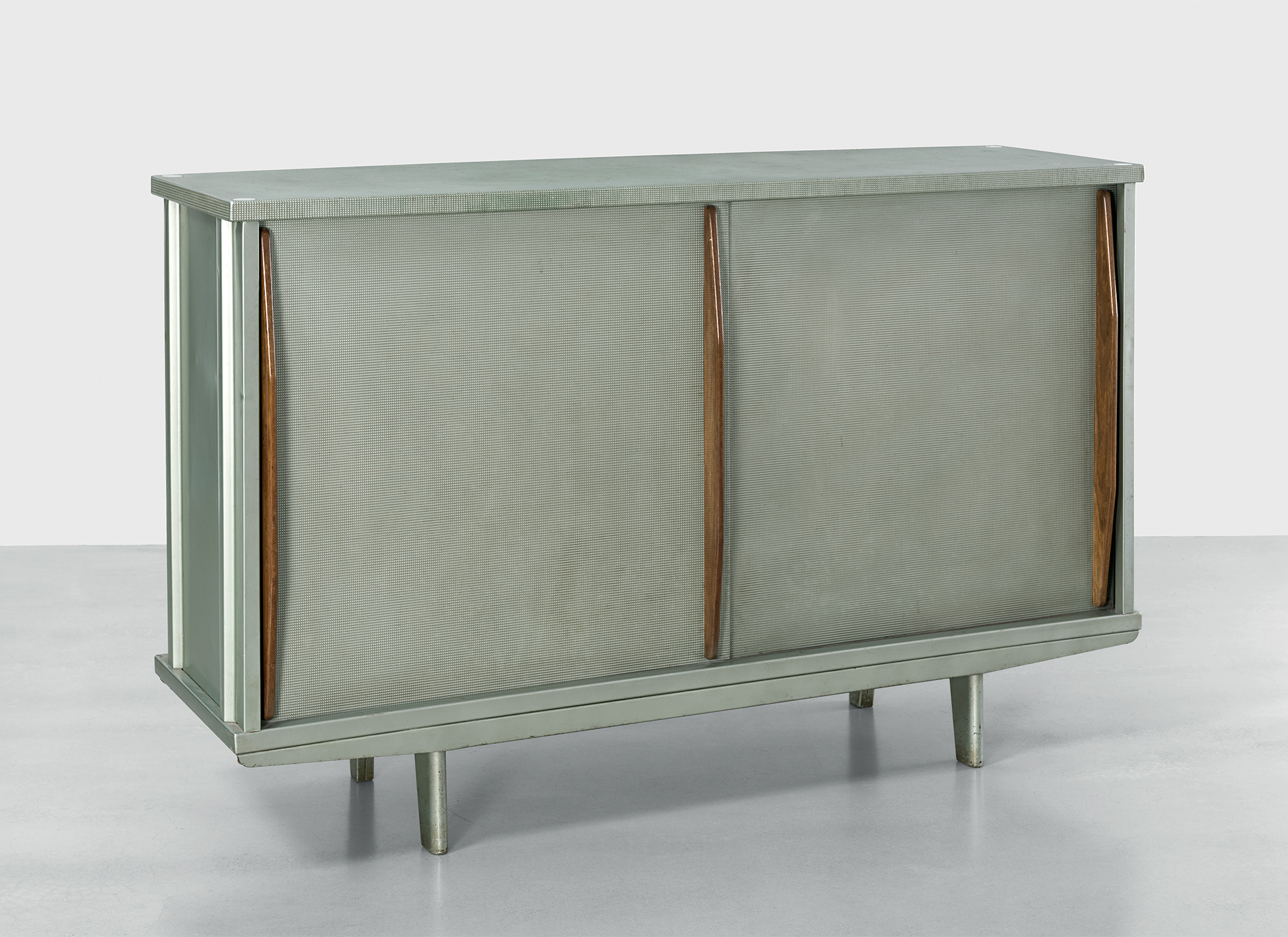 The wood and metal cabinets that emerged from the Ateliers Jean Prouvé in the 1930s were designed as sets of closed shelves with sliding doors, whose metal frame was attached to the wall.1 Work on them during the War, notably for Solvay firm, led to the design in 1 944 of a demountable household model whose overall characteristics underwent little change. From the version intended for the equipping of emergency accommodations through the aluminum models marketed until the late 1950s, the construction principle remained similar to that developed for wardrobes at the same period. This principle used two vertical, pressed metal sides with grooves into which were slotted shelf racks, these sides then extended by angle returns holding the plywood back. The metal parts were fixed to the top and bottom with threaded rod and wing nuts; these tie-rods ensured overall rigidity, which was further enhanced by the channels into which the shelf-supports were fitted and by the vertical, solid wood handles on doors sliding in top and bottom grooves. The same base was used for the various wardrobe and cabinet models and allows for their approximate dating.2 Although it was described as “standard” from 1948 onwards, the cabinet quickly gave rise to numerous variations, mainly in terms of the choice of materials: for the sliding doors, smooth aluminum sheet was used in 1941,3 then for mass production—along with Plexiglas—from 1946 onwards. Whether the doors were of wood or metal, the tops and bottoms were either solid or laminated wood, or aluminum sheet, or ceramic-coated. The metal parts were either painted or left bare, especially in the case of surfaces made of granite or diamond embossed aluminum. This kind of item became much more popular in the early 1950s,4 its diversity a result of growing demands from a clientele that seems to have especially appreciated the all-aluminum versions5 of which 110 examples were made in 1951. Designed as a demountable—like the wardrobe, it was delivered in kit form, to be assembled by the customer with a screwdriver and detailed instructions—the cabinet was also presented from the outset as stackable or juxtaposable. Combinations were used to create special-purpose items or partitions including a serving hatch in which three sideboards, two of them set back to back with, above, a third that opened on both sides, with a wood facade on the dining-room side and aluminum for the kitchen. They were also used for support-channel furniture (meubles suspendus or meubles équilibrés).