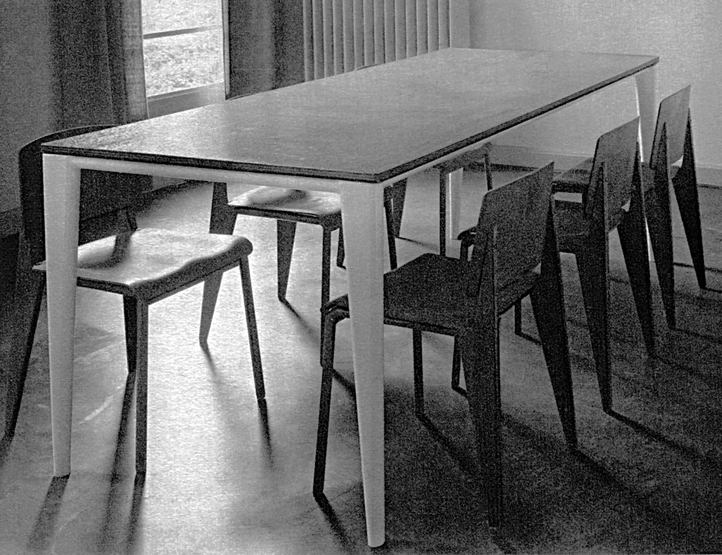 En 1936, les Ateliers Jean Prouvé complètent la gamme du mobilier destiné aux collectivités par un modèle de table de réfectoire. Souvent proposé en alternative au piètement « monobloc » de la table Cité, un nouveau modèle à quatre pieds fuselés en tôle pliée réunis par un châssis en tube soudé est présenté à l’occasion d’appels d’offres1 en 1936-1938. En 1939, l’équipement de la colonie sanitaire de Saint-Brévin-l’Océan (J. et M. André, arch.) induit la fourniture d’une trentaine de tables de cantine. L’étude reprend à partir du modèle créé antérieurement, pour s’adapter aux conditions climatiques particulières (notamment l’humidité de l’air) : toutes les parties métalliques sont galvanisées et les plateaux sont en dalles de fibrociment (Granipoli) fixés par des vis spéciales en laiton. Le châssis apparent en tubes carrés est renforcé par des traverses d’extrémité en tôle pliée, dont l’une est équipée de tubes porte-serviettes. Le même souci fonctionnel apparaît simultanément dans une autre fourniture importante : des tables de réfectoire pour une usine d’aéronautique, près de Marseille. Le châssis en métal laqué et doté de pieds fuselés au sabot chromé est équipé de tiroirs (avec compartiment à bouteille) et de crochets, et supporte un plateau en Granipoli. Ce sera vraisemblablement l’ultime application de ce châssis, remplacé après la guerre, pour ce type de programme, par des variantes de la table-bureau Dactylo ou par le nouveau piètement type Flavigny.