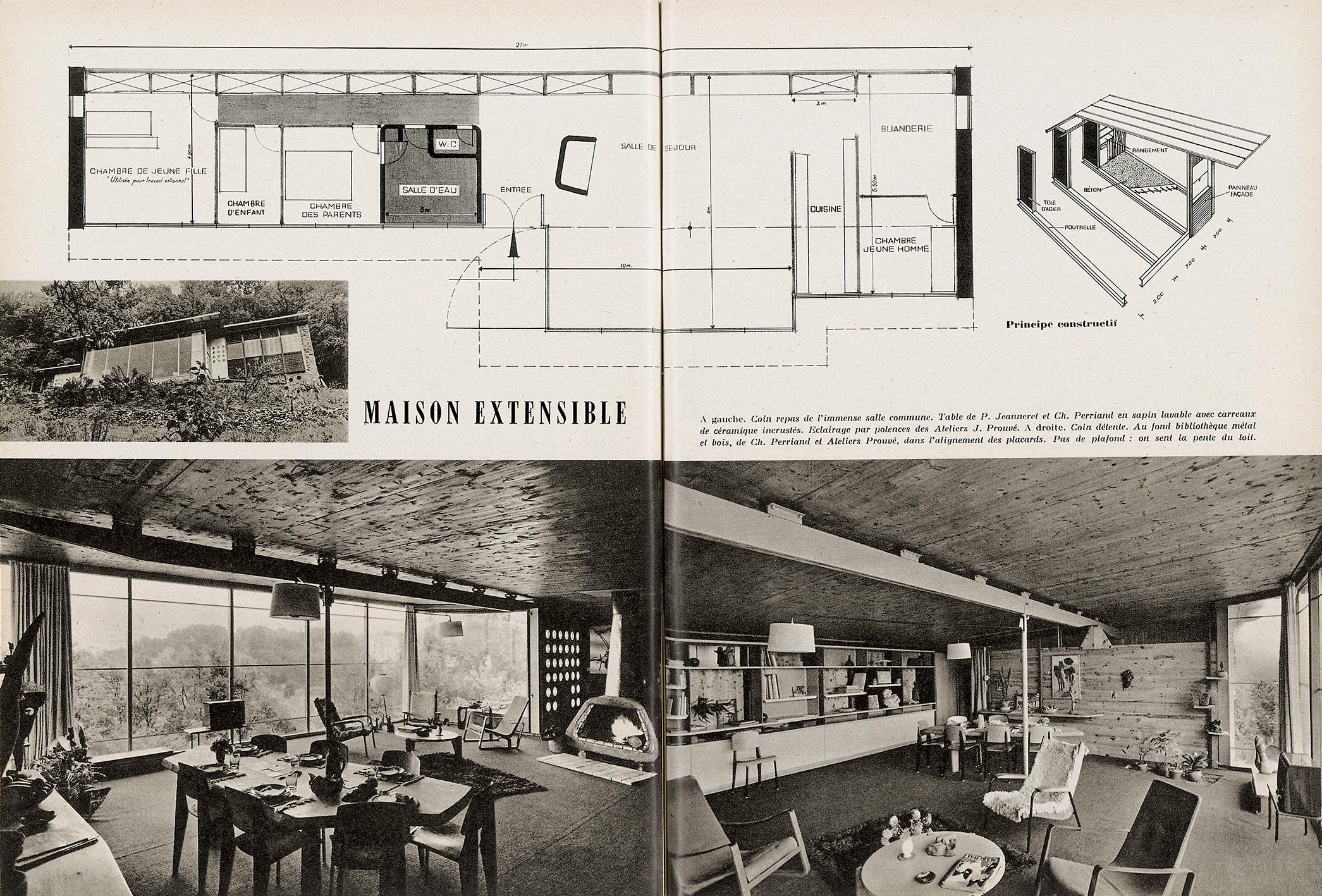 1. Fin juin 1953, en plein désaccord avec l’Aluminium français devenu actionnaire majoritaire de sa société, Jean Prouvé quitte ses ateliers de Maxéville pour rejoindre temporairement le bureau d’études de la firme à Paris ; bien qu’éloigné de l’usine, il dessine des bâtiments dont certains, tel le pavillon du Centenaire de l’aluminium (1954), figurent parmi ses œuvres majeures.