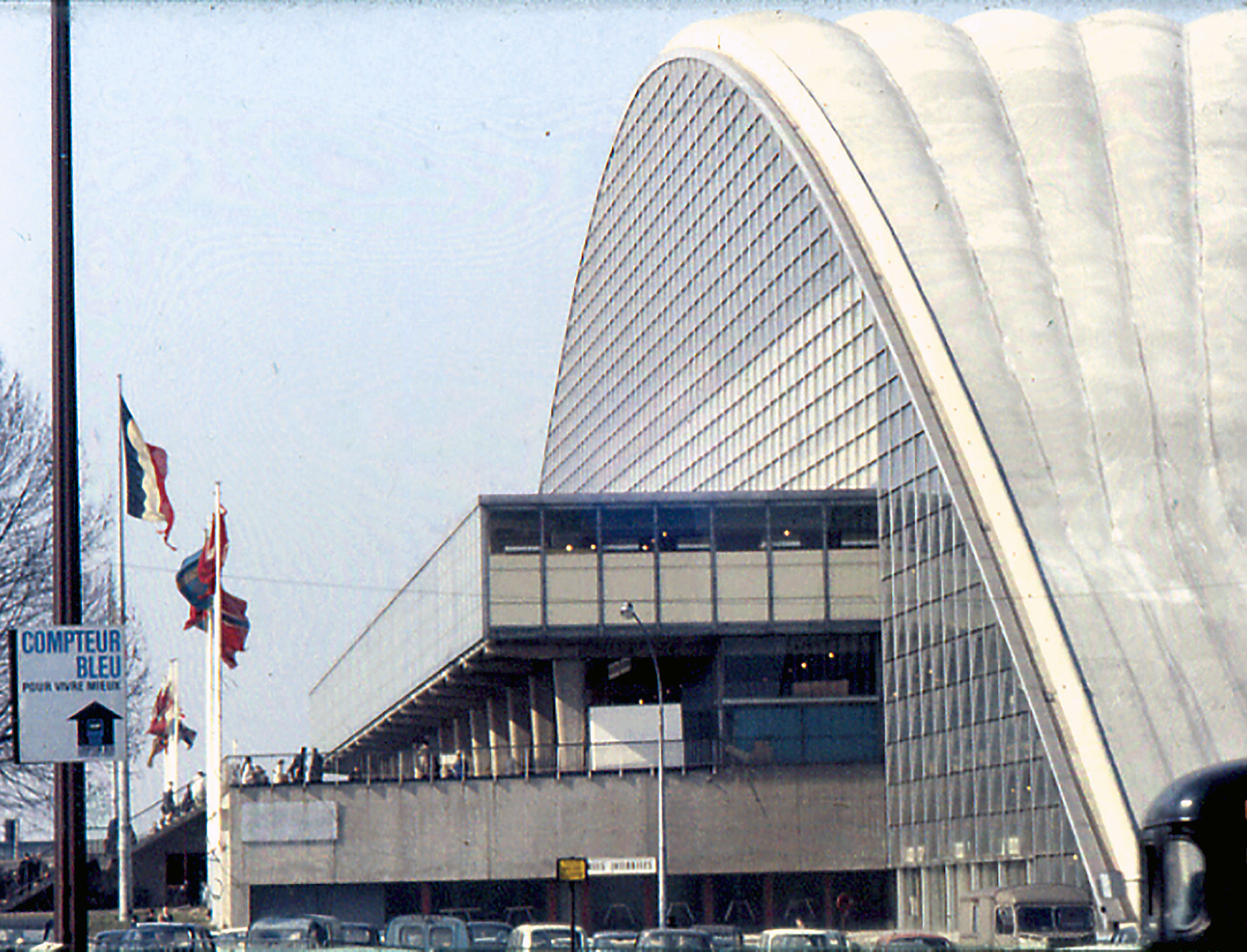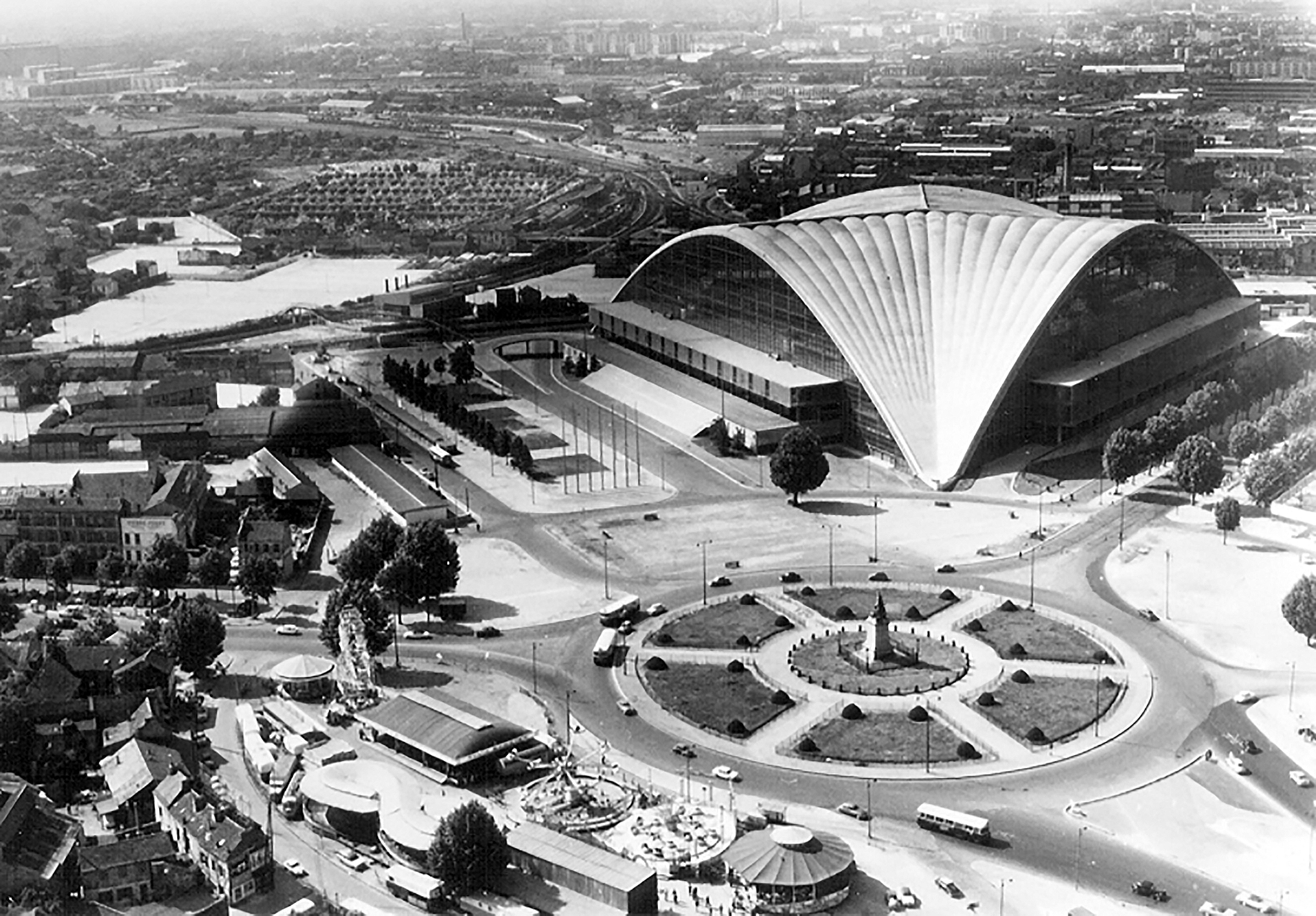C.N.I.T., Centre national des industries et des techniques, Paris-La Défense, 1956-1958 (R. Camelot, J. de Mailly et B. H. Zehrfuss, arch.). Au centre du rond-point, une statue « La Défense de Paris, 1871 », qui donnera son nom au futur quartier d'affaires. © Collection privée.